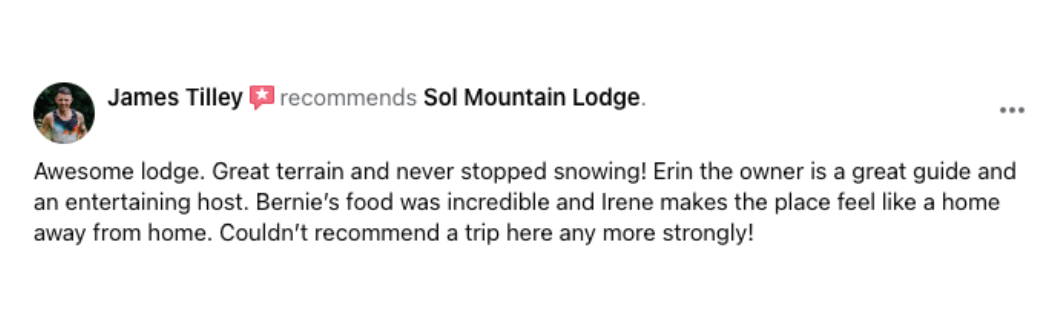 Sol Mountain is a helicopter-accessed backcountry lodge. All food and supplies are flown in and out. It is essential that all guests pack light. Bring your skis and wear your boots!Guest allowance is 20 lbs, plus day pack for skiing. Detailed packing lists and recommendations are delivered upon booking.